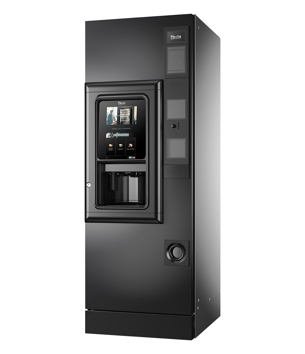 The machine supports up to 500 cups, with a 3 kg coffee bean capacity and up to 4 soluble canisters. It includes a mixer and motor doser with variable speed (24 V), ensuring consistent beverage preparation.